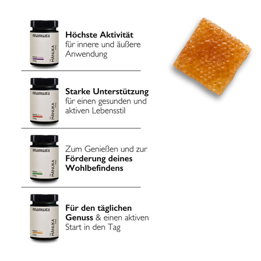🌟 Für deine Haut: Bei Hautirritationen oder kleinen Wunden kann Manuka-Honig direkt auf die Haut aufgetragen werden. Lass ihn seine Magie entfalten, bevor du ihn sanft abspülst oder mit einem Verband abdeckst.